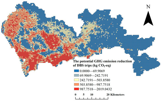 The split rate data of various transport modes were obtained from the Seventh Resident Travel Survey of Shenzhen. According to the survey results, in Shenzhen, the proportion of travel in private cars is 53%, the proportion of travel by bus is 18%, the proportion of travel by metro is 20%, the proportion of travel in taxis is 5%, and other modes account for 3%. Based on the above three datasets and Equation (1), we calculated the potential GHG emission reduction of DBS trips in each study grid. Figure 3 shows the spatial distribution of the potential GHG emission reduction of DBS trips in Shenzhen.