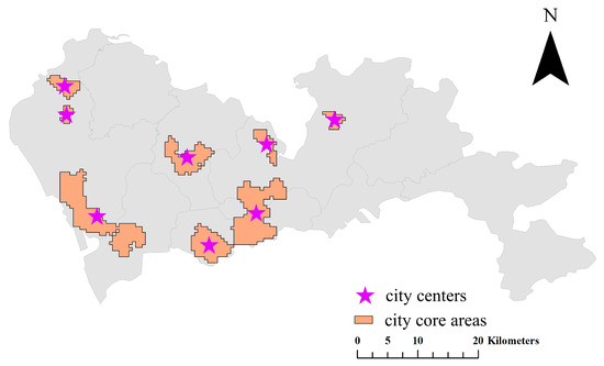 The population density data of Shenzhen is sourced from the WorldPop website (https://www.worldpop.org, accessed on 15 January 2023). According to the data from the Seventh Population Census of Shenzhen, we further amended the population data of each grid in the study area. Based on the above grid population data, we used the method proposed by Li and Liu (2018) [82] to extract eight urban centers of Shenzhen (as shown in Figure 5). Since regional location is crucial to DBS trips, the distance of each grid centroid to the closest city center centroid was computed to interpret the impacts of its location in the study area.