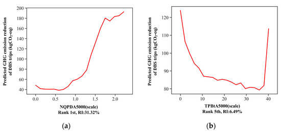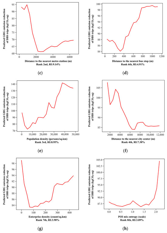 By visualizing the marginal effects of road network topological variables and built environment variables with PDPs, we further investigated the effective ranges and threshold effects of each independent variable on predicting the potential GHG emission reduction of DBS trips. As is shown in Figure 6, we plotted the PDPs of the eight most important variables tested in the GBDT model.