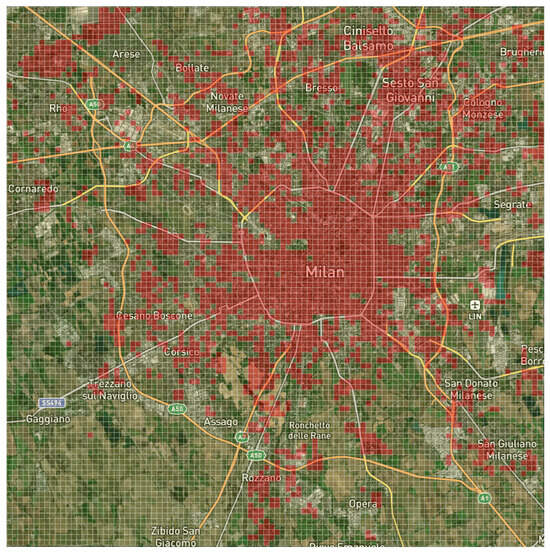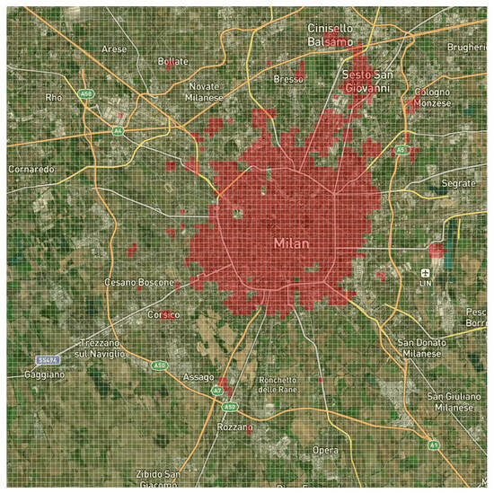 However, Telecom Italia, in association with several universities and foundations, has made available the data that will be used in this study. This dataset stands out due to its open- and multi-source aggregation of data from diverse sources, such as telecommunications, weather, news, social networks, and electricity information for the city of Milan [27]. We will focus on the telecommunication data, which consist of CDR data aggregated in 10 min intervals on a 100-by-100 grid (squared cells with an approximate size of 235 × 235 m) that covers the city of Milan (Figure 2a).