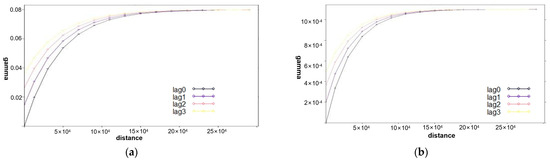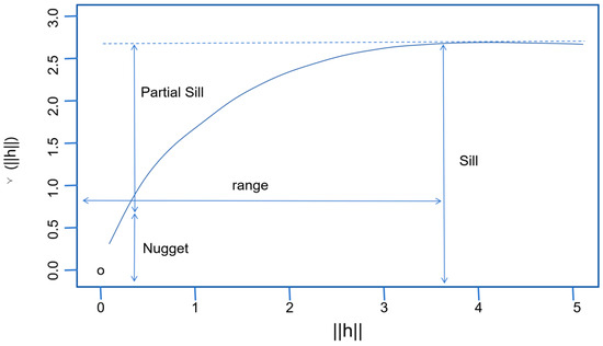 A semivariogram is used to quantify the spatial and/or temporal autocorrelation between sample points in a spatial data set. It can characterize the degree of spatial and/or temporal variation in the variables of a geographical process within a given distance and/or over a certain period of time. In short, it can help to show how sample data are correlated with each other as distance and/or time change [19,20]. The semivariogram is defined as
