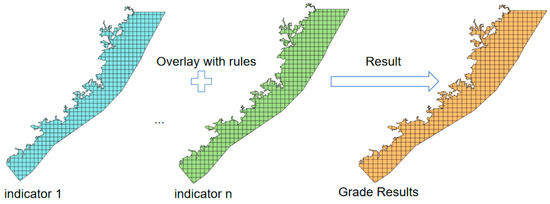 Since the overlay analysis function provided by general GIS software cannot easily meet the complexity of the seawater quality evaluation standards, it is necessary to define the overlay rules through customized methods to perform an overlay analysis of multiple indicators, and ultimately determine the seawater quality level in each small area. The process of overlay analysis is depicted in Figure 2.