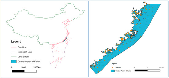 This article focuses on the coastal waters of Fujian Province, China, as the area of the study. The Fujian marine area includes subtropical ocean and a shallow continental shelf sea, forming a junction of cold and warm currents. The coastal waters under study cover an area of 36,000 square kilometers, with a diversified marine ecosystem that is rich in various marine resources, including abundant fishery resources and seabed minerals. The locations of the region and of the water quality monitoring stations are shown in Figure 3.