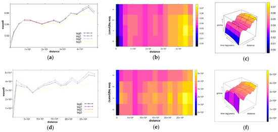 The key to fitting a theoretical semivariogram model lies in estimating the range, sill, and nugget values. In this study, the empirical semivariogram and the method of minimizing the Mean Squared Error (MSE) index are used to determine the nugget value, sill value, and range value. Firstly, the empirical semivariogram is used to make an initial estimate of these values. The nugget value can be approximated as the intercept on the y-axis, i.e., when x = 0, the value on the y-axis represents the estimated nugget value. The sill value corresponds to the y-axis value when the curve tends to stabilize, which typically occurs at a larger distance h, where the semivariogram value no longer increases significantly with increasing distance. The range can be estimated by finding the x-axis value at which the curve rises from the origin to half the sill value. By observing the empirical semivariogram plots, Figure 6a,d, and referring to the methodology shown in Figure 1, an initial range for the parameters is determined. Subsequently, the parameters are fine-tuned and the MSE is minimized to determine the final and accurate values of the range, sill, and nugget.
