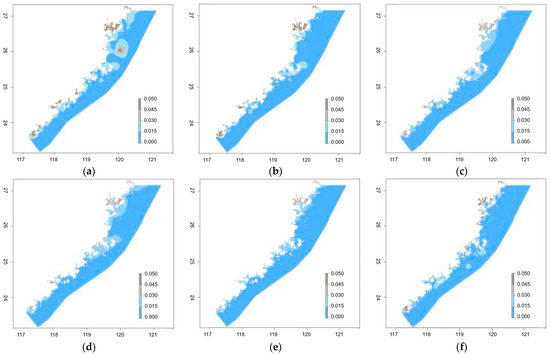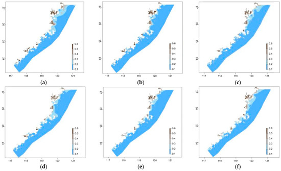 Visualization of changes in the reactive phosphate content in the nearshore waters of Fujian Province from 2019 to 2024: (a) 2019; (b) 2020; (c) 2021; (d) 2022; (e) 2023; (f) 2024.