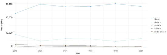 We extract the number of grid cells representing different seawater quality levels from the raster image in Figure 7 and multiply it by the actual sea area represented by the grid (500 m × 500 m) to calculate the actual area of different classified sea regions. Table 3 shows the actual area conditions of the different classified sea regions in the coastal waters of Fujian Province (annual data for 2019 to 2024).