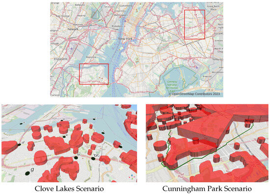 The first scenario contained 17 barrier polygons around Clove Lakes Park in northern Staten Island and was prepared by manually selecting points to be used as start and end points, to provide various combinations of obstacles between pairs of points in order to assess the GP performance (Figure 1). A second scenario in NYC required navigating beyond the airport’s restricted zone near Cunningham Park, and the height limit was varied or removed to assess the optimization’s response to the changing z-dimension availability. The third scenario was central Porto and Gaia (Figure 2), in northern Portugal, and contained the deep valley of the Douro river, potentially aerially navigable.