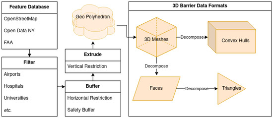 Figure 3 illustrates the data preparation workflow for the two study areas. Data were obtained from open online sources, primarily OpenStreetMap [29] and OpenDataNYC [30], and filtered by type. Sensitive buildings and areas were then buffered laterally and vertically to create 3-dimensional restricted zones. Because intersection algorithms using simple geometries are significantly faster than algorithms using more complex meshes, barrier datasets were decomposed into their geometric primitives, such as faces, triangles, or convex hulls. For convex hulls, a barrier is intersected if any of the vertices of the 3D line are contained within the hull. The terrain representation of Porto consisted of a raster DEM, in TIFF format, and can theoretically be triangulated and sparsified for improved performance [31].