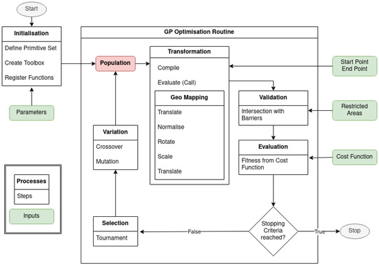 Figure 4 shows the generalized GP optimization workflow developed on top of the DEAP framework. During initialization, a starting population is randomly generated according to user-set parameters. These candidate solutions are then validated by checking whether their intersection with the barriers is an empty set. Valid solutions are then evaluated by quantifying their fitness. A cost function measures the fitness of an individual as a solution, according to the optimization criteria, and the population is subsequently ranked by fitness. The cost function returns the navigational cost of the route, which is the object of minimization, so lower fitness values mean higher suitability. With all the fitnesses known, the best-performing individual is compared to the stopping criteria. If this solution is sufficiently apt, the routine terminates and the optimization is complete; otherwise, the population is varied by mating pairs of individuals or randomly mutating genes in an individual. Individuals with better fitness (lower cost) have a higher probability of mating, mutating, or passing on to the next generation unchanged. After this variation, the offspring generated becomes the starting population of the next generation, and the process repeats. The processes of selection, crossover, and mutation are collectively referred to as genetic operators. The data and code are publicly accessible on Zenodo [35]. See Appendix E for a detailed description of each step in Figure 4.