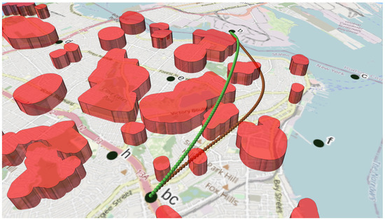 For the path validation, the geographic path is plotted in the same space as the 3D barriers and is validated by checking whether any intersection exists between it and the barriers. There are several approaches, varying in accuracy and performance. Computational load is affected by the intersection algorithm used and the geometry representation: the solution can be considered as a collection of line segments (high computational cost) or vertices (low cost). Likewise, barriers can be considered as 3D meshes (high cost), or collections of concave hulls (medium cost), or collections of 3D polygons with a height attribute (low cost). Another possibility is to use 2D polygons with a height attribute. This has a low computational cost but limits the third dimension to a single range per polygon. Accuracy is equally affected by geometric representation. The vertices of a path may not intersect a barrier, although its segments do [9]. More intricate geometries can be represented with 3D meshes than with convex hulls or polygons.