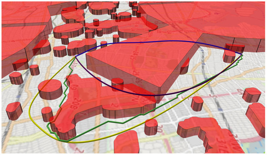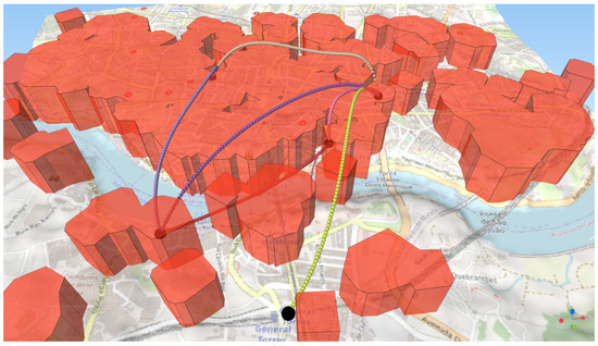 Varying the global height limit also shows how the algorithm can adapt to different scenarios. In the real world, there is a flight height limit of 213 m, which forces the optimization to navigate around restricted areas of 300 m height. The 500 m limit represents a situation where the airport zone is completely impassable, but the 300 m high zone over the park can be flown over. With no global height limit, the optimal route goes directly over the airport zone (blue line in Figure 7). In the Porto–Gaia scenario, trajectories can navigate between and over restricted areas without intersecting the DEM (Figure 8).