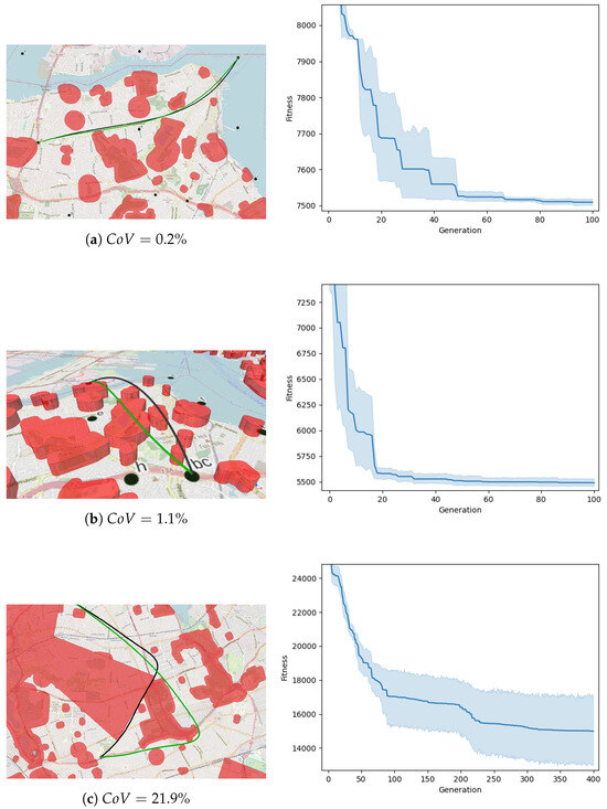 Considering the stochastic nature of the initialization, variation, and selection operations, it is not surprising that optimizations with the same inputs can vary significantly. To visualize the convergence of the evolutionary process, multiple optimizations for the same problem were computed, varying the random seed state. The results show a relatively high diversity in fitness values in earlier generations, which eventually converges as the objective is reached. The 95% confidence intervals in Figure 10 show that optimizations with different starting states converge to a near-optimal solution after 50 generations for the scenario shown in Figure 10a, and 20 generations for the scenario in Figure 10b. In the third scenario, Figure 10c, the optimization fails to converge after 400 generations. Due to the complexity of this scenario, the search is vulnerable to local optima, and the initial state has a significant effect on the outcome. The minimum fitness after 400 generations ranges from 11,979 m to 25,434 m for a route with a reference theoretical minimum distance of 11,813 m.