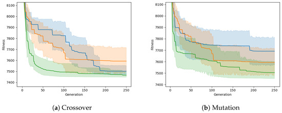 Crossover and mutation directly affect the diversity of the population, which is effectively the search radius. Additionally, crossover can produce more specialized offspring by combining the beneficial traits of both parents. Figure 11 shows how optimization performance increases with a higher probability of both crossover and mutation. This illustrates how larger values allow for a quicker and broader search and may aid in avoiding or escaping local minima. Increasing these values also increases the processing time because more evaluations are required for the higher number of altered offspring.