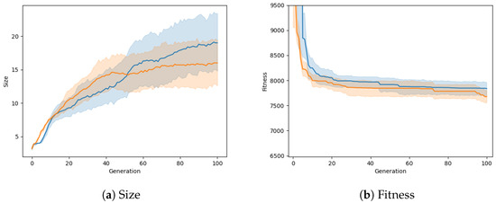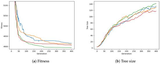Effective bloat control using elitism is well documented [36,37], and the effect of elitism on solution size, especially in later generations, is also shown in Figure 13. After 120 generations, tree size starts to proliferate and this bloating is constrained proportionally to the elite fraction, albeit inconsistently.