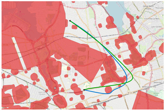 Two areas in NYC with restricted flight areas (red polyhedrons) and experimental start and end points (black points). Projected coordinate system: EPSG:32118 (NAD83/New York Long Island). Hildemann and Verstegen [9]’s result is also shown (green trajectory).