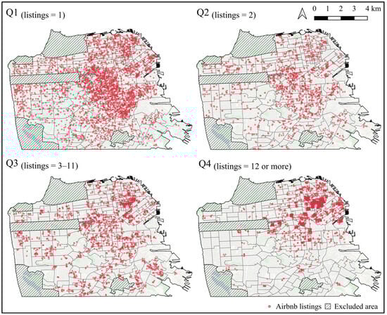 The broader literature on Airbnb commercialization has suggested categorizing Airbnb listings into quartiles based on the number of properties a given host manages within the same city [22,44]. An explorative analysis of our data also indicated that this is an effective way to differentiate between single- and multi-unit hosts while also accounting for different levels of commercialization among multi-unit hosts. Accordingly, the listings in San Francisco were divided into four mutually exclusive categories: Airbnb operated by hosts who had one listing (quartile 1; N = 3238), two listings (quartile 2; N = 1285), three to eleven listings (quartile 3; N = 1858), and twelve or more listings (quartile 4; N = 2103) in San Francisco. The geographic locations of Airbnb listings are presented in Figure 2.