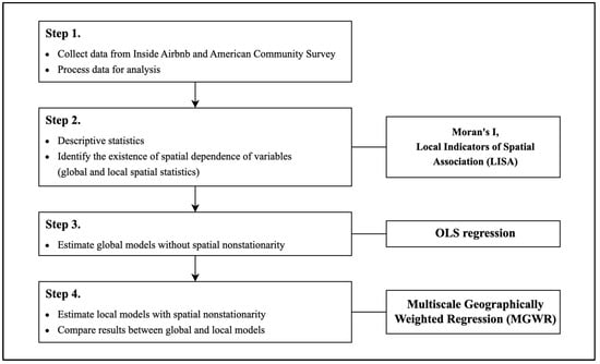 However, one cannot assume that the strength of the effect of Xi on Yi will be equal to that of Xh on Yh. As the First Law of Geography suggests, closer things are more related than distant things [46]. The GWR model reflects this role of distance in the strength of relationships using spatial bandwidth and weight [47]. There are several spatial weighting functions, such as fixed Gaussian [48,49] and bisquare [50] functions, and adaptive Gaussian and bisquare functions, which attempt to mitigate exaggeration of the degree of nonstationarity [51]. The current study used the adaptive bisquare weighting function provided in the MGWR software [52]. If the weighting function determines the strength of the effect of variables in adjacent regions, the spatial bandwidth defines the range of nearby regions to be considered for estimation [53]. This article used the multiscale geographically weighted regression (MGWR) method, which does not use a fixed bandwidth for all variables but determines the bandwidths for each variable in the model [54]. The golden selection method was used to choose the optimal bandwidth for each variable, and the MGWR model was optimized using AIC scores. The visualization of the results was produced using the geographic information system (GIS) software QGIS [55]. Figure 4 summarizes the data analysis process.