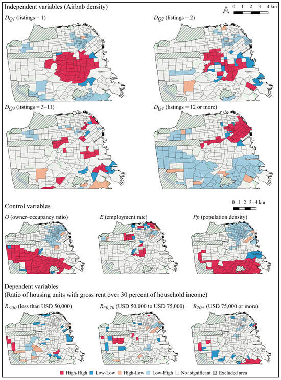 Moran’s I is an indicator of the presence of spatial clustering at the global level. Local spatial patterns, even those that were not detected by global spatial indicators, can be identified using local indicators of spatial association (LISA; [63]). LISA statistics produce four types of clusters, categorized based on the values of the cluster and those of the neighboring region: high-high, low-low, high-low, and low-high. For example, the high-low type suggests a region with a high value that is surrounded by regions with low values. The current study calculated local Moran’s I values to produce LISA statistics [63]. The resulting local Moran’s I cluster map suggests the presence of local spatial autocorrelation (Figure 5). An interesting characteristic is that the density of Q4 Airbnb listings (DQ4) showed a similar local spatial pattern to the owner–occupancy ratio (O), although the two showed inverse LISA statistics in most regions. For example, the high-high regions of DQ4 overlap with the low-low regions of O, and the low-low regions of DQ4 overlap with the high-high regions of O. This suggests that Airbnb Q4 listings (the most commercialized quantile) are densely populated in the regions where the proportion of renters is higher.
