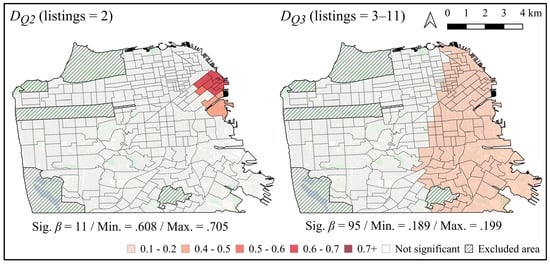 Regarding the differential effect among Airbnb listing subdivisions, the OLS and MGWR models consistently predicted that Airbnb units from hosts who only have one listing (Q1; the least commercialized quartile) did not affect the relative rent cost. In contrast, the Q3 Airbnb units (hosts with 3–11 listings) showed a statistically significant positive relationship in both the OLS and the MGWR models. Additionally, Airbnb units in Q2 also exhibited a positive relationship, but only in the MGWR model. When comparing the impacts of DQ2 and DQ3, DQ2 showed higher standardized coefficients than DQ3. However, areas with a statistically significant effect of DQ2 on relative rent costs are mainly concentrated in areas near the Financial District neighborhood, while the effect of DQ3 is significant in wider regions that cover the east side of San Francisco. To summarize, the least commercialized Airbnb listings had no impact on the relative rent cost, while more commercialized listings are positively related to the relative rent cost, and the affected area increases along with the level of commercialization. Nevertheless, this study could not reveal why the most commercialized Airbnb units (12 or more listings) did not show a statistically significant relationship in the MGWR model.