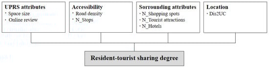 The foundation of shared usage of space is that the space can be visited by different groups. Therefore, the achievement of resident–tourist sharing of UPRS relies on the factors that attract both groups. A serious of studies have confirmed that space attributes, spatial accessibility, surrounding environment feature and location were related with space visits [19,32,33,34,35,36,37]. However, it is unknown whether these factors play similar roles in predicting shared usage of UPRS by residents and tourists. Drawing on previous studies, we identified independent variables from four facets including space attributes, accessibility, surrounding attributes, and location, investigating their influence on shared usage of UPRS (Figure 1).