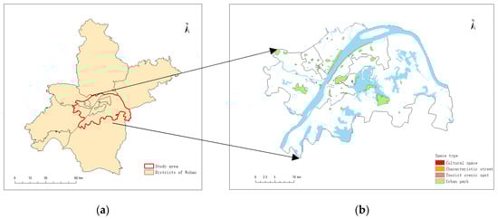 Public open space is supposed to be open with free access to all [14]. Notably, recreational spaces that require an entrance fee may exclude certain groups due to economic constraints. Thus, we mainly focused on non-profit recreation spaces. Under this premise, we finally selected 138 representative UPRS open to residents and tourists free of charge as the case study objects, drawing from the classification of UPRS by Wu et al. (2003) [7] in conjunction with spatial location and a list of recreational space published by the Department of Culture and Tourism of Hubei Province. The selected UPRS encompassed a diverse range of features and functions, including urban parks, cultural spaces, characteristic streets, and tourist scenic spots (Figure 2).