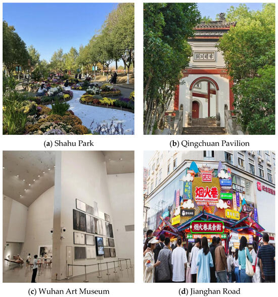 Four types of UPRS (Source: photos taken by author). (a) Urban parks. (b) Tourist scenic spots. (c) Cultural spaces. (d) Characteristic streets.