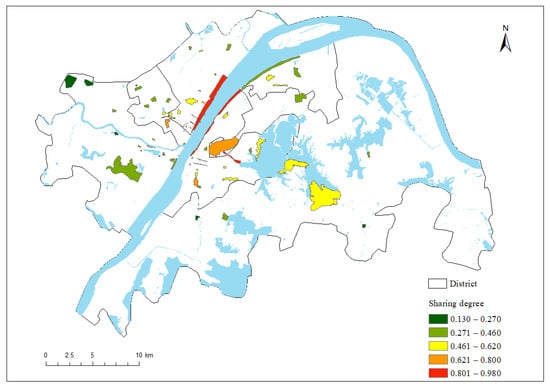 The resident–tourist sharing degree of UPRS varied greatly in spatial distribution (Figure 5). The resident–tourist sharing degree showed a declining trend from the center towards the periphery. In particular, UPRS located near lakes and rivers exhibited higher levels of resident–tourist sharing, such as Jianghan Road Pedestrian Street, Hankou River Beach Park, Chu River and Han Street, and Shahu Park. The high-sharing UPRS were mainly distributed in the urban center, particularly along both sides of the Yangtze River. Conversely, the low-sharing UPRS tended to be situated on the periphery of the city, especially in the northwestern region.