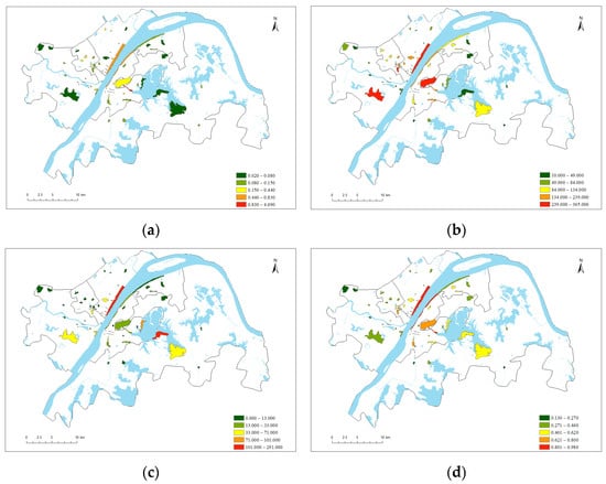 Figure 2 shows the spatial distribution of various types of UPRS within the study area. The distribution pattern of UPRS exhibited a concentration in the urban center and dispersion in the periphery. Among the 74 UPRS, urban parks were the most prevalent type and were evenly distributed across the majority of the study area, followed by characteristic streets, cultural spaces and tourist scenic spots, and the last three types were mainly located on both sides of the Yangtze River.