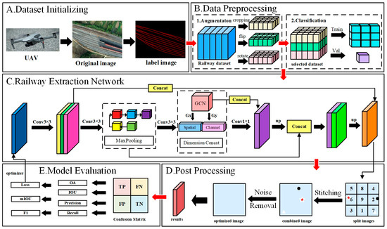 During the railway track segmentation process, challenges often arose regarding the low accuracy of the extraction results. Given the high resolution and complex information of the images used in this study, obtaining satisfactory extraction results was particularly challenging. To address this, images were segmented into smaller blocks and augmented to increase the dataset size, with the extracted results reassembled in the process. Subsequently, morphological algorithms [24] were employed to eliminate noise and refine the extraction results. Finally, model performance was evaluated using a confusion matrix and standard metrics such as MIoU, accuracy, and F1 score. Loss values were iteratively fed back into the network structure during training to obtain optimal weight values.