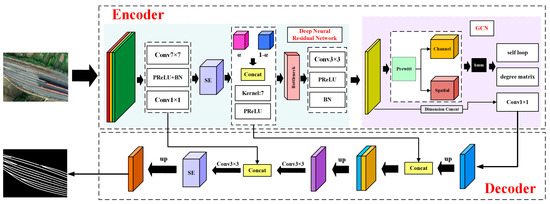 In both the residual chain and decoders, this study introduces the spatial channel squeeze-and-excitation module (scSE), which integrates channel and spatial dimension information to enrich the representation of deep semantic features. The scSE mechanism enables the model to focus on important spatial features while suppressing irrelevant background noise. Furthermore, this research incorporates a graph convolutional network (GCN) at the lower layers of the model to capture deep image features and their interrelationships. GCN enhances the model’s ability to understand and process spatial relationships in an image by constructing a graph structure that captures the spatial relationships between different regions in an image. This structure helps to accurately delineate different regions in an image, especially boundaries in complex structures, which are essential for accurate boundary detection. By constructing a graph structure, the model can gather global contextual information and use it as node features, effectively enhancing its ability to recognize and segment complex image structures. The network architecture diagram is shown in Figure 2.