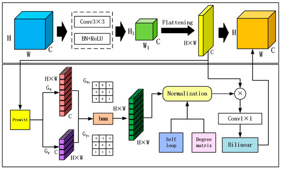 In Equation (5), and represent the application of the Prewitt operator in the x and y directions, respectively, to detect gradients and create the adjacency matrix A. The product of these two matrices captures the gradient information across both spatial dimensions, and the identity matrix is added to ensure self-loops, allowing for each node to retain its feature information. After constructing the adjacency matrix, the Laplacian symmetric normalization algorithm is applied to effectively preserve the structural information of the graph. This normalization process eliminates any imbalance in the adjacency matrix, promoting balanced relationships between nodes. Subsequently, the normalized adjacency matrix is multiplied with the original features to integrate the graph’s topological structure information with node features. This fusion process enhances the capture of both local and global graph information. Following this, a series of 1D convolutions and ReLU activation functions further abstract node features, making node representations more expressive. The final result is expressed as follows: