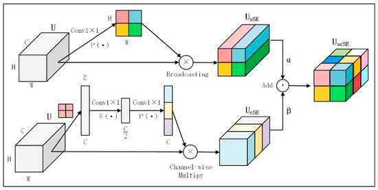 The fundamental concept of the scSE (spatial channel squeeze-and-excitation) module [33] involves the simultaneous operation of two sub-modules, cSE (channel squeeze-and-excitation) and sSE (spatial squeeze-and-excitation). This concurrent integration enhances information across both spatial and channel dimensions. Let the input feature map be denoted as U. The scSE structure is shown in Figure 5. The formulation is expressed as follows: