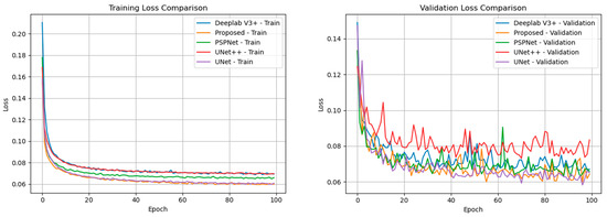 When considering the validation set, the proposed model consistently maintains the lowest validation loss, indicating its excellent ability to generalize to unseen data. UNet and UNet++ also perform well on the validation set, although their losses are slightly higher. In contrast, DeepLab V3+ and PSPNet show higher and more fluctuating validation losses, suggesting poorer stability and weaker generalization ability.