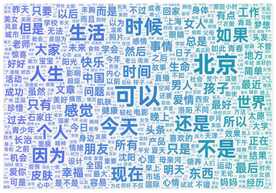 The corpus of CSNER was sourced from Sina Weibo, one of the largest social media platforms in China. Self-designed web crawler technology was used to obtain a large quantity of targeted social text data from the internet. After systematic screening and data cleaning, the Weibo content of real users was sorted to construct a corpus covering a total of 68,864 information-rich Weibo posts published by 3449 users from 2015 to the present. After analyzing the word frequency statistics of these microblogs, the top 2000 words with the highest frequency of occurrence were taken to build a word cloud, as shown in Figure 1. From the word cloud, it can be found that the CSNER dataset can more accurately reflect the language style, expression habits, and toponym usage on the microblogging platform because it comes directly from the microblogging platform. Compared with other datasets, other public datasets do not contain the latest online phrases, hot topics, or emerging toponyms because they were created earlier. The CSNER dataset was constructed more recently, which enables the CSMNER model to capture the latest trends and be more up-to-date. The self-constructed dataset allows for strict quality control to ensure annotation quality and consistency and reduce noise. The microblog text in the CSNER dataset usually contains a large amount of informal language, abbreviations, network terms, and emoticons, and contains many names of people, toponyms, organizations, and other words of different natures. They not only reflect the users’ daily life and interests but also contain a lot of rich geographic information. It more fully reflects the linguistic characteristics of the Chinese social media environment. By collecting these social media text data, we have constructed a comprehensive and authentic Chinese social media corpus, which provides a solid foundation for the task of Chinese toponym entity recognition.