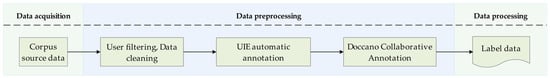 The data annotation session is shown in Figure 2, and the study first uses the Baidu UIE (universal information extraction) interface for automatic annotation [34]. This step greatly improves annotation efficiency and ensures the rapid completion of basic annotation. However, errors may exist in automatic annotation. Therefore, Doccano, a collaborative annotation platform, was further used for manual correction and refined management. The use of the Doccano platform both improves the consistency of annotations and ensures annotation accuracy through multi-person collaboration. This ensures that the final generated corpus meets the high standard requirements in natural language processing and provides reliable data support for various downstream tasks.