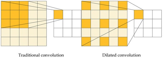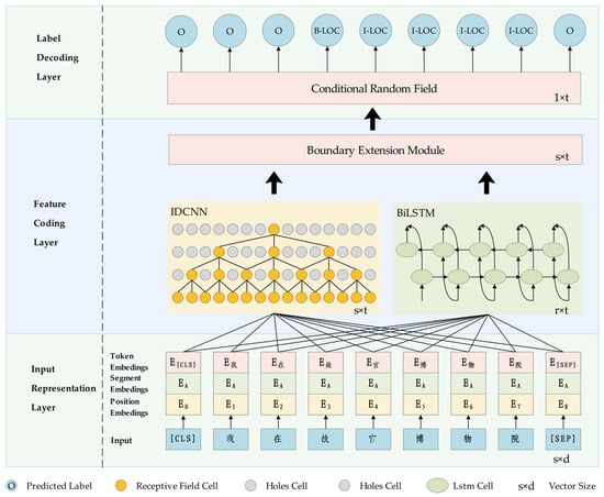 In English, a word can convey complete semantic information, while in Chinese, a phrase is needed to express the complete meaning. Moreover, Chinese does not have obvious word boundary characters or capitalization features, which makes entity boundary recognition difficult. Therefore, word boundary information is an important factor in Chinese NER [36]. The model proposed in this paper uses two neural network structures, the improved IDCNN and BiLSTM, to extract semantic features. Figure 4 shows that the IDCNN is an iterative dilated convolutional neural network. By introducing holes in the convolution kernels, it can expand the receptive field without increasing the number of parameters and computational complexity, better capturing long-range dependence information in the text. By stacking convolutional layers with different dilation rates, features at different scales can be extracted, providing multiscale feature representations for the text sequence. This multilevel feature extraction helps capture the subtle differences in entity boundaries and the complex features of entity types, thus improving the recognition accuracy of NER. In text, the convolutional operation can capture local patterns, such as phrases or word groups, which are especially useful for recognizing short toponyms. When sliding over the entire text sequence, the weights of the convolutional operation are shared, which helps the model learn common features across text positions.