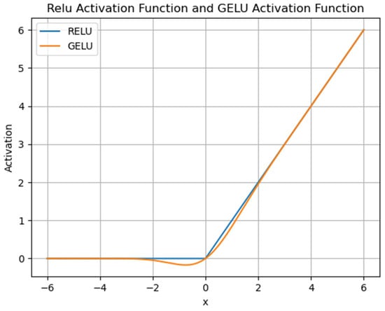 Compared with the traditional IDCNN module, the proposed model replaces the rectified linear unit (ReLU) activation function with the Gaussian error linear unit (GELU). The GELU is a smooth function, and its nonlinear nature is more complex than that of the ReLU, as shown in Figure 5. This means that the GELU generates a more stable gradient flow during optimization, which contributes to convergence stability during model training and reduces the oscillation during training. Its design is inspired by the cumulative distribution function (CDF) of the Gaussian distribution, which in theory can better simulate the probability distribution characteristics of natural language when processing natural language data, thereby improving the model’s ability to learn language features.