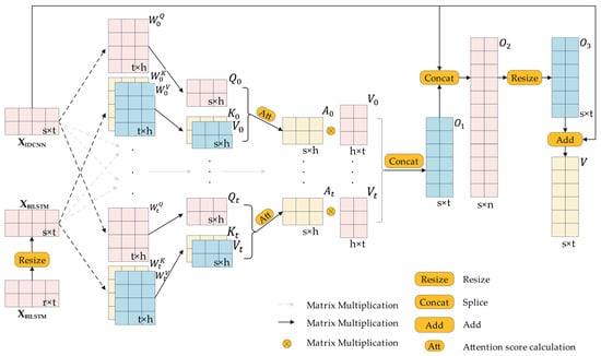 where , , and are the linear transformation matrices of the queries, keys, and values, respectively; and are the feature vectors obtained by BiLSTM and IDCNN, respectively; , , and are the query matrix, key matrix, and value matrix for each head, respectively; and is the scaling factor.