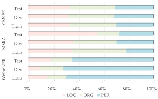 In this paper, the three experimental datasets are each divided into three parts: a test set, a validation set, and a training set, with the ratio of the number of corpora among the three being 7:1.5:1.5. Figure 7 shows the proportions of annotated entities in each dataset, and the proportions of the three types of annotated entities in each dataset are relatively balanced. Table 4 shows the annotation examples of the corpus in the datasets. The CSNER and WeiboNER datasets have meaningless expressions such as punctuation marks and “哈哈 (haha)”; the corpus in the MSRA dataset is formalized and carefully annotated, and the news corpora contain many abbreviated toponym entities such as “港 (Hong Kong)” and “台 (Taiwan)”, which are sufficiently difficult and representative to effectively test the named entity recognition model for Chinese social media and evaluate the robustness of the proposed model.
