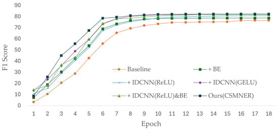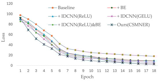Figure 9 further shows that the model CSMNER proposed in this paper can learn useful features as soon as possible, as the Loss value can decrease rapidly during the learning process and then level off. Compared with the Baseline model, the added BE module and IDCNN (GELU) network play different degrees of positive roles in the feature learning process of the model.
