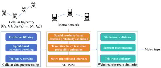 An overview of our approach is presented in Figure 1. We first employ a series of data-processing approaches for trajectory denoising and merging. Then, we propose a spatial–temporal hidden Markov model (ST-HMM) to detect a candidate metro trip, considering the local spatial–temporal characteristics of individual positions in cellular trajectories. Specifically, we propose a spatial proximity-based approach to estimating emission probabilities, enabling the detection of candidate metro stations for observed cellular towers. Based on that, we develop a transition-probability estimation method based on travel time to determine whether a trip between two towers likely involves the metro. When the likelihood is minimal, we assign the two consecutive towers to separate trips. This method enables us to simultaneously identify transportation modes and segment trajectories. We then utilize the Viterbi algorithm to efficiently detect candidate metro trips. Furthermore, we propose a weighted trip-route similarity measure that considers global spatial–temporal characteristics to filter out dissimilar candidate trips. This involves defining the station-route distance and the segment-route distance, as well as introducing a trip-route similarity measure to quantify the similarity between metro routes and candidate trips.