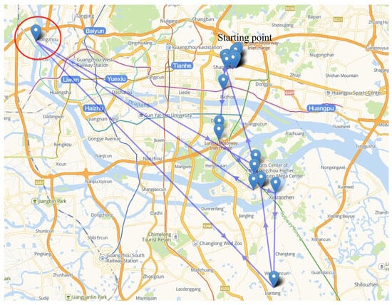 We implemented our approach and the baseline approaches in Python. The LightGBM algorithm was implemented using scikit-learn (https://scikit-learn.org/stable/index.html (accessed on 10 July 2024)). Moreover, we used the official navigation service to obtain the travel time (https://www.gzmtr.com/ (accessed on 10 July 2024)).