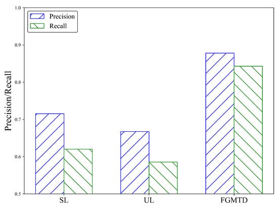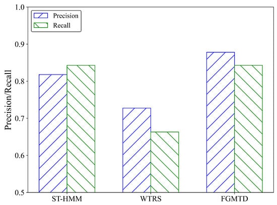 The results of precision and recall for different variants are presented in Figure 4. Notably, FGMTD outperformed the sole use of ST-HMM or WTRS in terms of precision and recall. This improvement was achieved by combining ST-HMM and WTRS, highlighting the effectiveness of considering the characteristics of both individual positions and the entire trajectory.