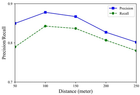 When calculating the emission probability, we employ a distance threshold, , to filter out irrelevant cell towers. A smaller value can enhance computational efficiency, but it may also mistakenly filter out some relevant cell towers, leading to a decline in performance. To evaluate the impact of this threshold, we conducted experiments using values of 50 m, 100 m, 150 m, 200 m, and 250 m. The results of precision and recall versus different values are shown in Figure 5. As the threshold increases, precision and recall initially demonstrate improvement before eventually declining. When is set to 100 m, our approach attains optimal performance with respect to both precision and recall. This choice strikes a balance: when is too low, only a few cell towers are considered for trip identification, resulting in the loss of valuable information. Conversely, when is excessively high, irrelevant cell towers are included, introducing noise into the identification process. Therefore, the setting of 100 m strikes a balance by including relevant towers while minimizing the inclusion of irrelevant ones.