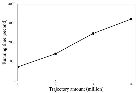 We used the large dataset to evaluate the efficiency of our proposed approach. Moreover, we used different amount of trajectories to evaluate the efficiency and scalability of our proposed approach. The trajectory amount was set to 1 million, 2 million, 3 million, and 4 million in our experiments. The running time of FGMTD versus different trajectory amounts is presented in Figure 6. Impressively, our approach demonstrated remarkable efficiency by successfully identifying metro trips from the trajectories of 4 million users in approximately 3200 s. Moreover, as the volume of data increased, the processing time scaled linearly, demonstrating the scalability of our model to large datasets.