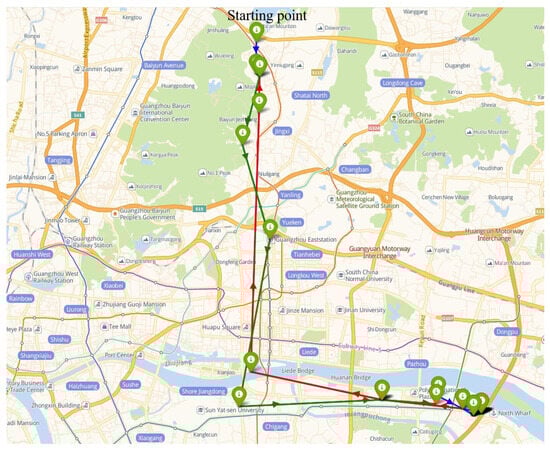 As shown in Figure 9, the outlier in Figure 8 has been removed, and the detected metro trips are highlighted using different colors. Specifically, a red line and a green line represent two detected metro trips. We further detail the detection results in Table 4, which reflects the user’s commuting patterns. In the morning, the user took Metro Line 3 from Tonghe Station, transferred to Line 8 at Kecun Station, and finally arrived at Wanshengwei Station. In the evening, the user returned by taking Line 8 from Wanshengwei Station, transferring to Line 3 at Kecun Station, and ultimately reaching Tonghe Station. This case study effectively demonstrates the accuracy and utility of our method in detecting fine-grained metro trips.