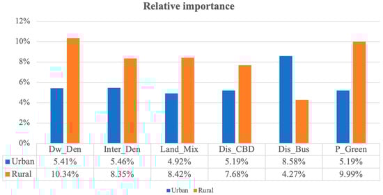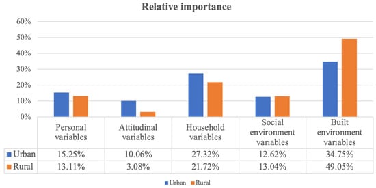 In this study, we chose five categories of independent variables from three aspects: socio-demographics, attitudes, and the neighborhood-level social and built environment. Relative importance indicates that built environment variables have the largest effect in both urban and rural areas but play a more important role in rural regions (49.05%) than in urban regions (34.75%). On the contrary, household, personal, and attitudinal variables contribute more highly in urban areas. The social environment has similar relative importance in both urban and rural areas.