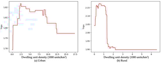 In urban areas, the curve of dwelling unit density resembles an inverted u-shape (Figure 4a). Bus use rises rapidly when the dwelling unit density changes from 17 to 2400 units/km2. Afterward, it remains almost steady when the dwelling unit density increases from 2400 to 9500 units/km2. Beyond this range, bus use declines as the dwelling unit density is extremely high. In rural areas, within the range of 100 to 500 units/km2, bus use among older rural adults increases sharply and then fluctuates from 500 to 1200 units/km2 (Figure 4b). Beyond the threshold of 1200 units/km2, it drops rapidly with some volatility.