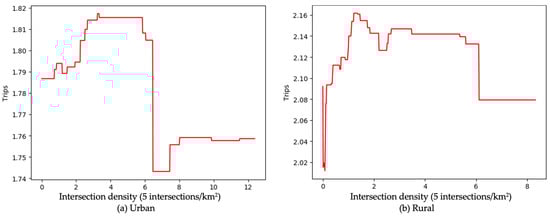 Figure 5a demonstrates that bus usage among older urban adults appears to steadily increase almost linearly within the range of 0 to 15.1 intersections/km2. It reaches a peak when intersection density is in the effective range of 15.1 to 27.1 intersections/km2. Afterward, it drops sharply. Figure 5b shows that the number of daily bus trips of elderly rural adults fluctuates at a high level within the range of 7.5 to 26.8 intersections/km2. Finally, it undergoes a sharp decrease when the intersection density is over 28.1 intersections/km2.