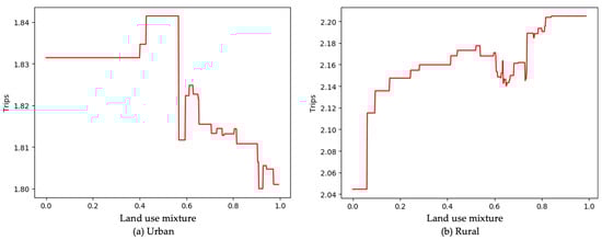 The effective and reliable range of the mixture for rural older adults is generally higher than that for urban ones (Figure 6a,b). Low land use mixture in rural contexts usually refers to high ratio of land with residential and agricultural functions, which does not attract older adults to travel more. Therefore, an increase in land use mixture will play a foreseeable role in improving bus usage among older adults [61]. However, in urban areas, once the EI exceeds a threshold value of 0.57, bus trips drop sharply (Figure 6a). Similar effects of land use mixture have also been found by prior studies on metro usage and e-bike ownership [65,70]. However, the nonlinear impacts of land use mixture on walking duration are quite different, with a u-shaped curve among older adults [24]. A possible reason is that the daily needs of older adults can be satisfied within the vicinity of their homes if the land use is more complex. In this context, older people are more inclined to choose walking or cycling over public transit.